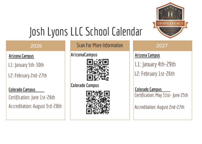 The L1 Horse Training Program will help you develop leadership skills and give you the insight on how to set up clinics, develop sponsor relationships, advertise, and market your business. The students develop lifelong friendships, along with learning how to interact with others in the equine industry to acquire clients and business contacts. Upon completion of this L1 horse training program, the students receive a certificate as a Lyons Legacy Trainer. Each student will learn how to format clinics, apprenticeships and demonstrations utilizing their strengths and skills.